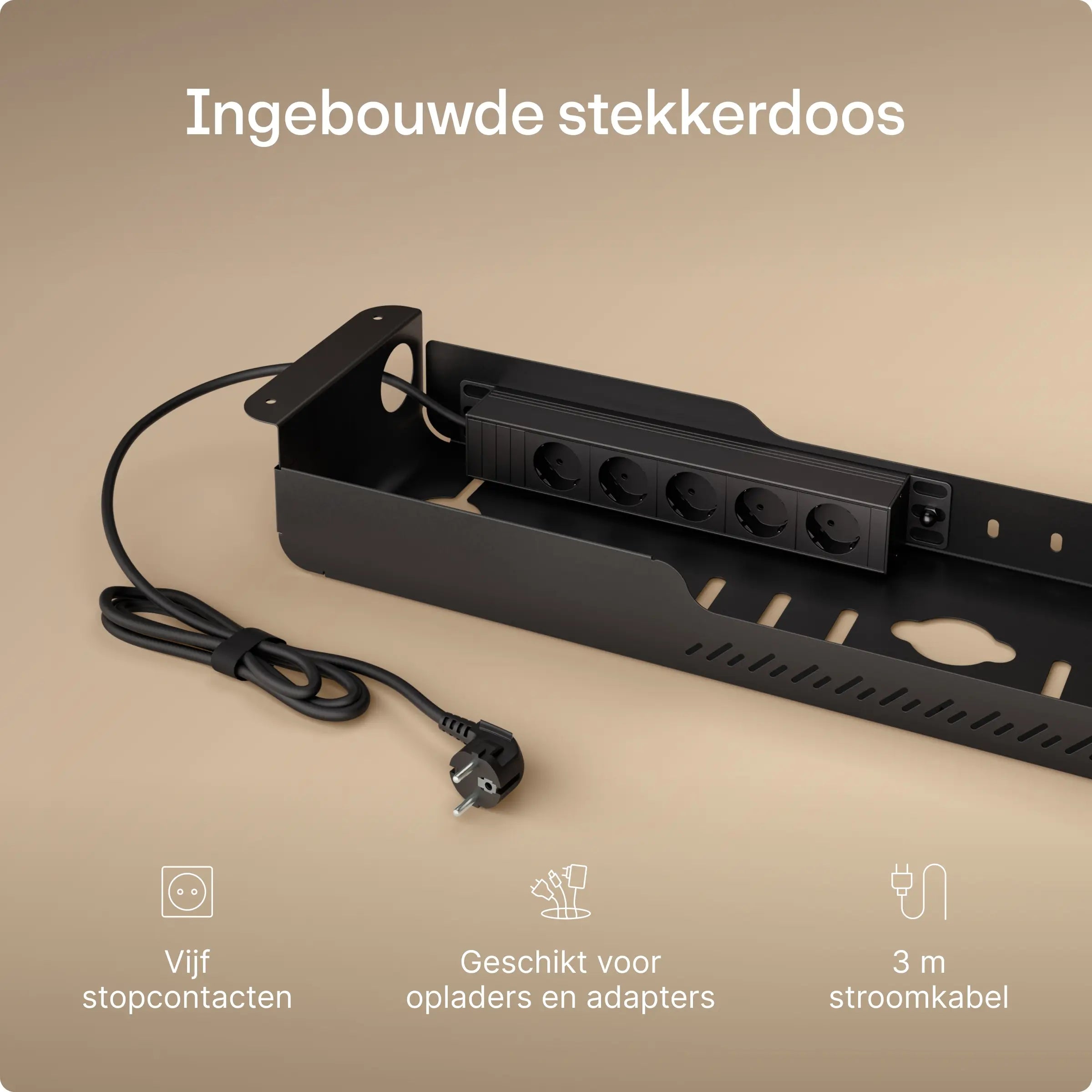 Cable Management Pro is ontworpen voor het opbergen van alledaagse kabels en draden, zoals stroomkabels, adapters, opladers en verlengsnoeren – allemaal netjes opgeborgen in de kabelbak onder het bureau.