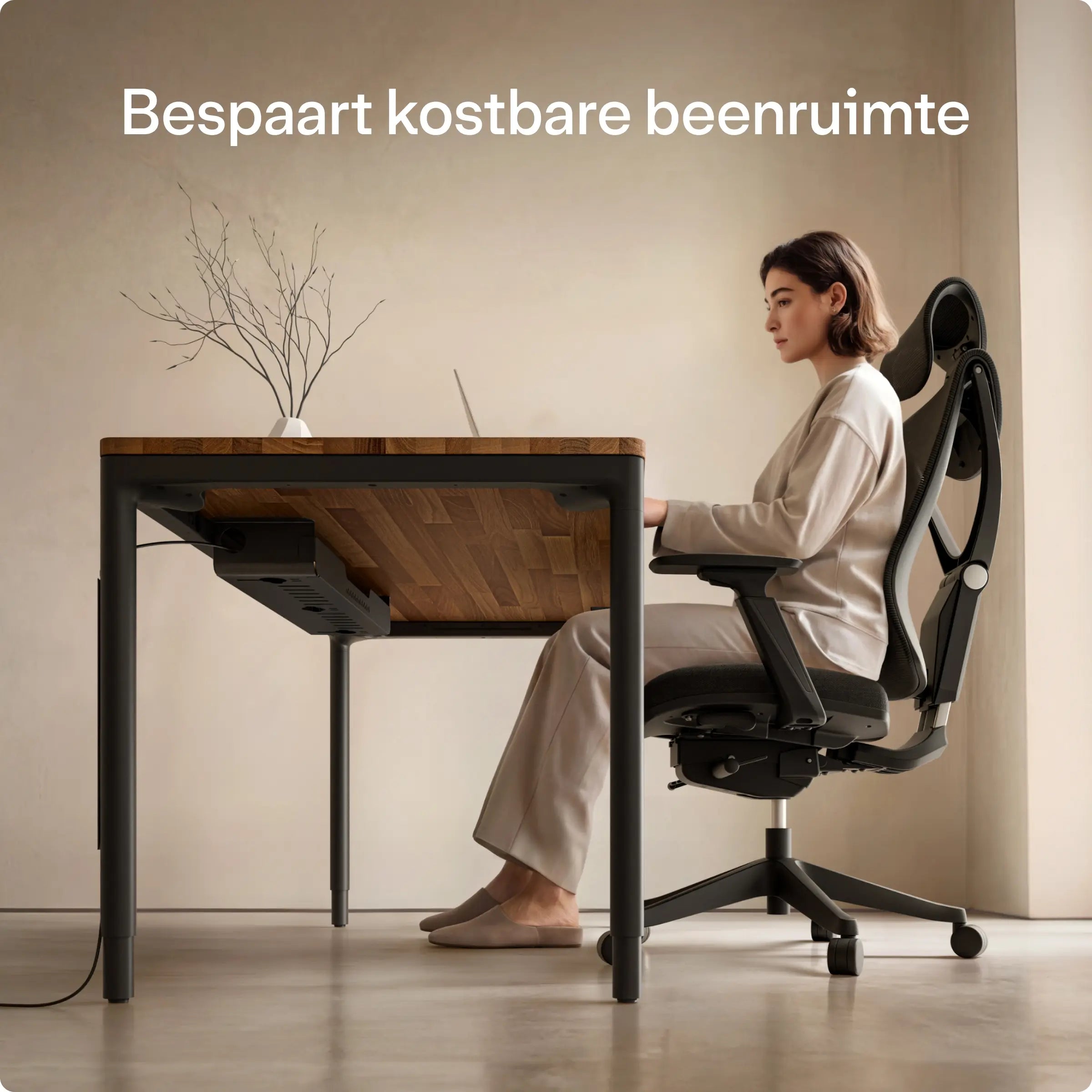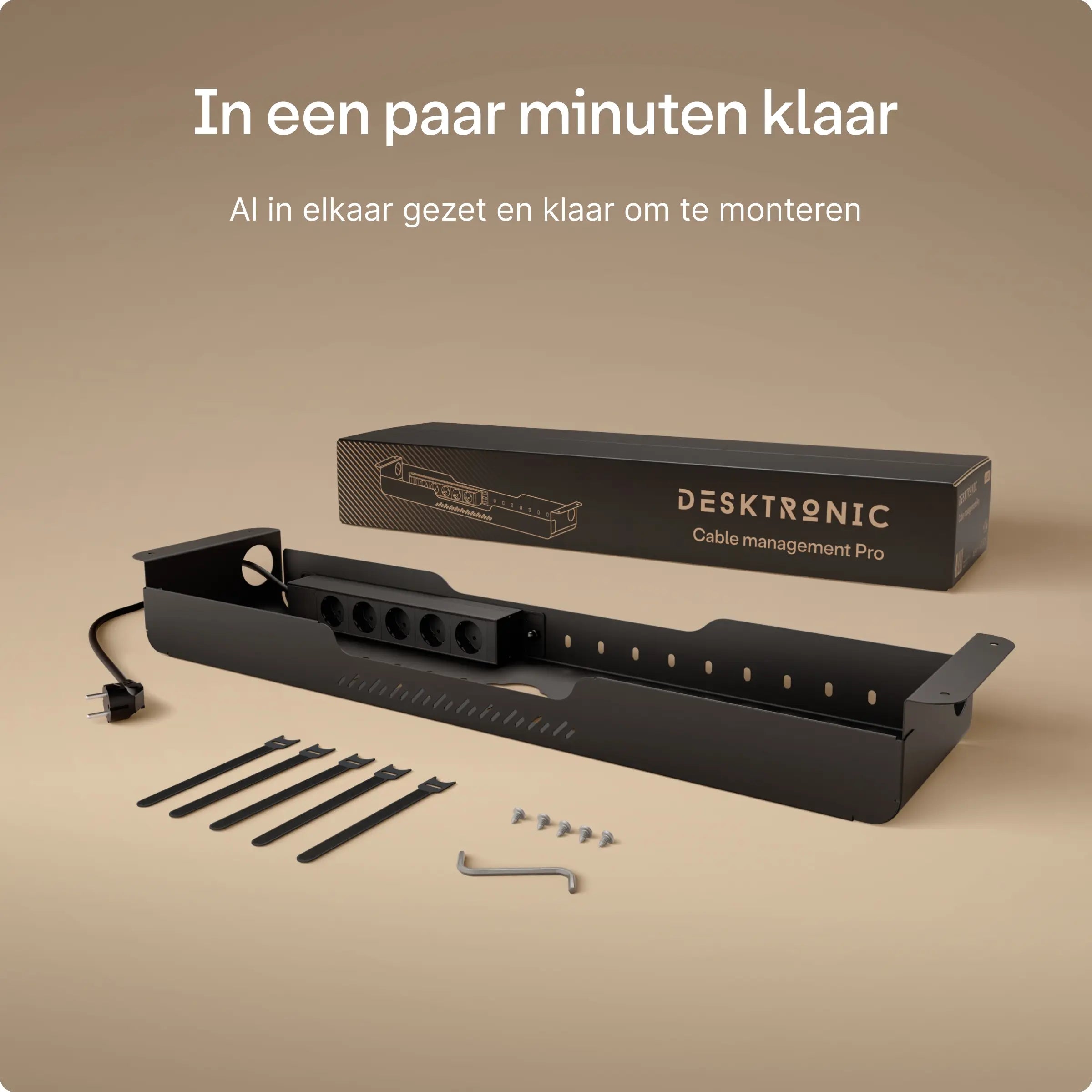 De installatie is eenvoudig. Cable Management Pro wordt voorgemonteerd geleverd en kan met de meegeleverde schroeven netjes onder uw bureau worden bevestigd. Binnen een paar minuten is het systeem geïnstalleerd en kunt u aan de slag.