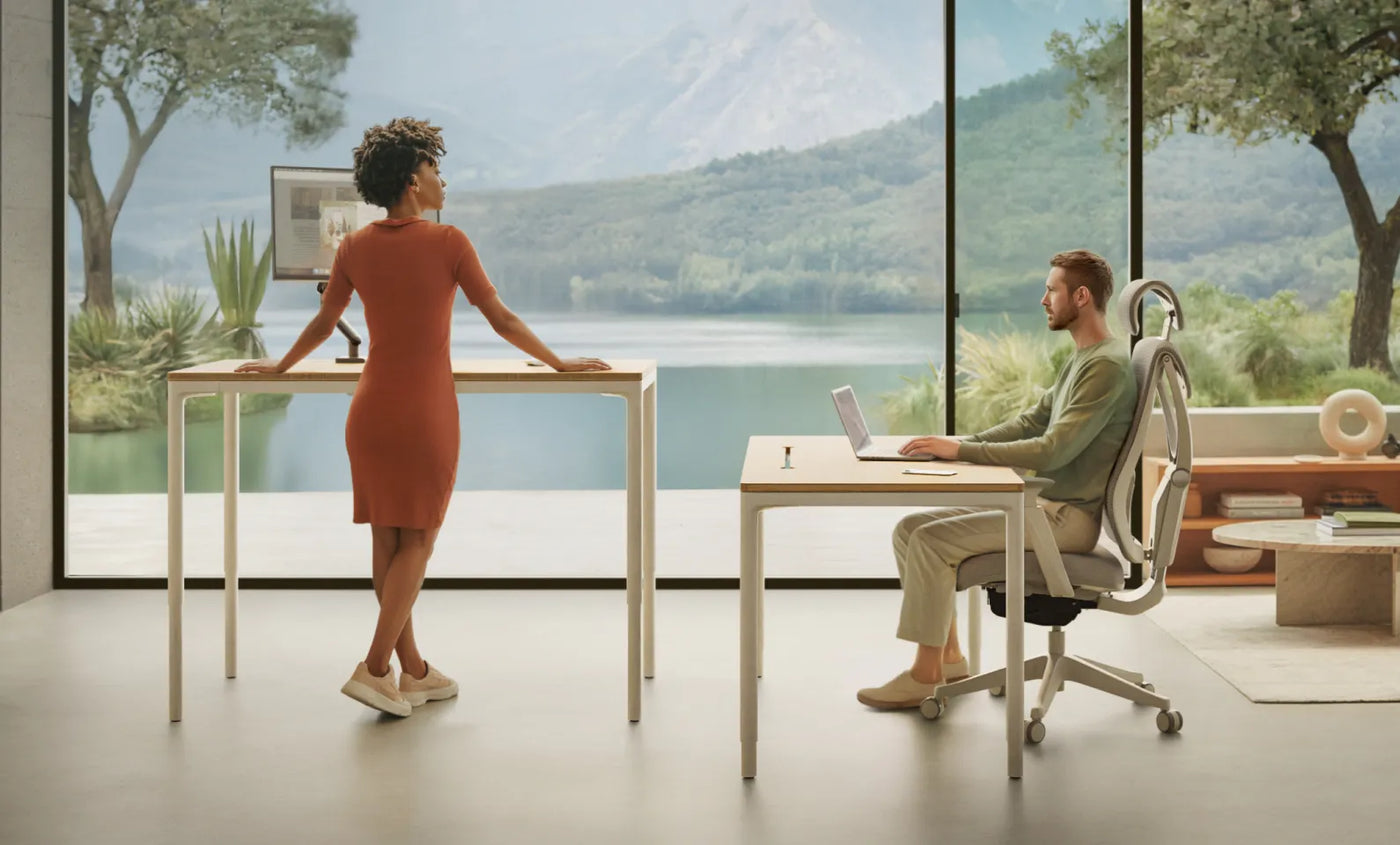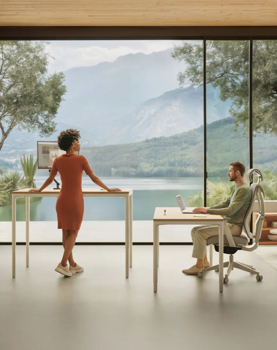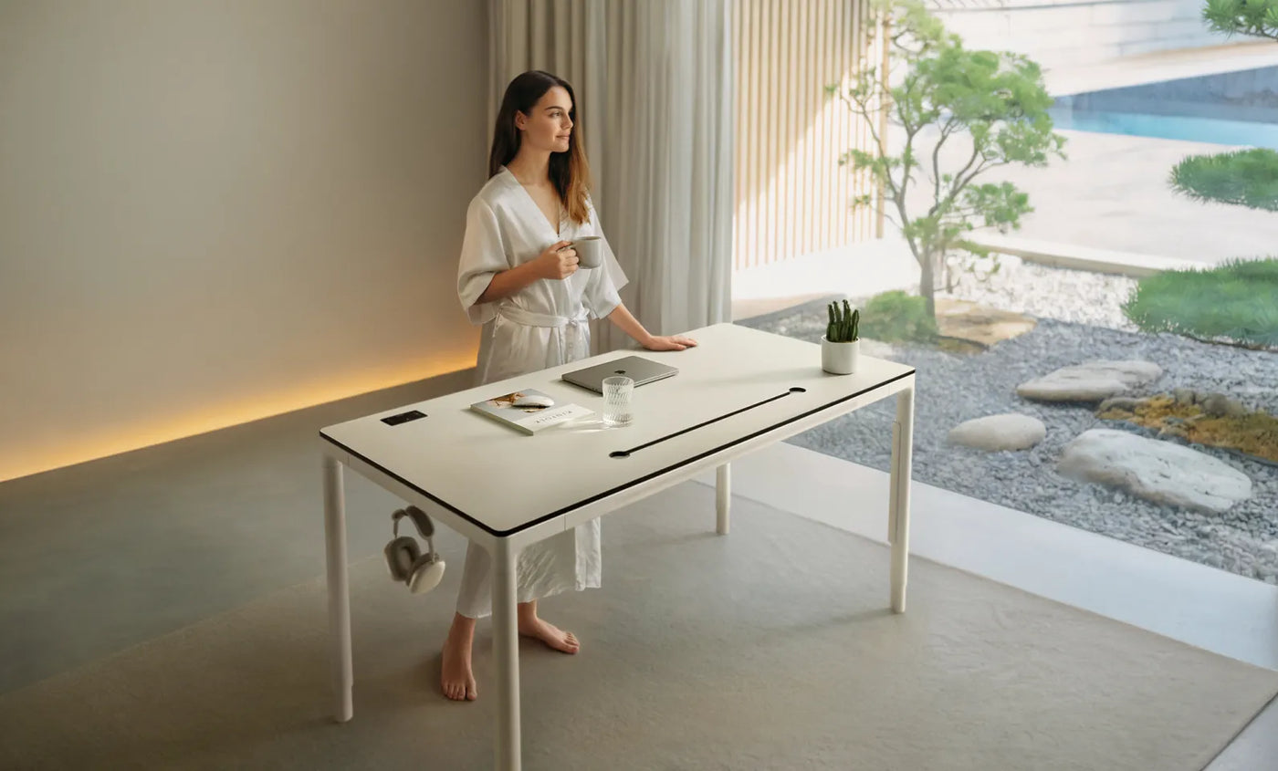 Kies uit supersterk compact, natuurlijk massief hout of duurzaam bamboe. Het superlichte ontwerp en de gladde, afgeronde hoeken zorgen voor comfort, veiligheid en een tijdloos design. Allemaal gemaakt rond het sta-bureau met vier poten dat is ontworpen om met je mee te bewegen.