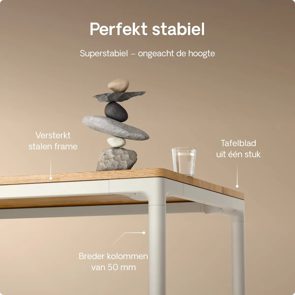 Dankzij de extra sterke metalen poten en het versterkte frame biedt de tafel een ongelooflijke stabiliteit. Hij blijft perfect stabiel en wiebelt niet, zelfs niet op maximale hoogte en met elk formaat tafelblad.