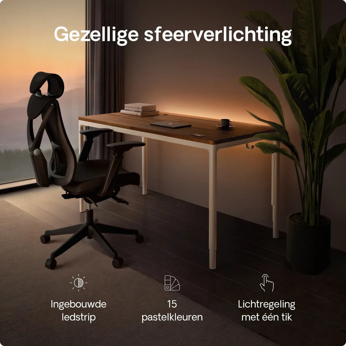 Met de ingebouwde ledstrip met 15 zachte lichtmodi kun je de sfeer creëren die je nodig hebt om te werken, creatief bezig te zijn of te relaxen. Van koele concentratietinten tot warme avondkleuren, evenwichtig licht voor elke setting.