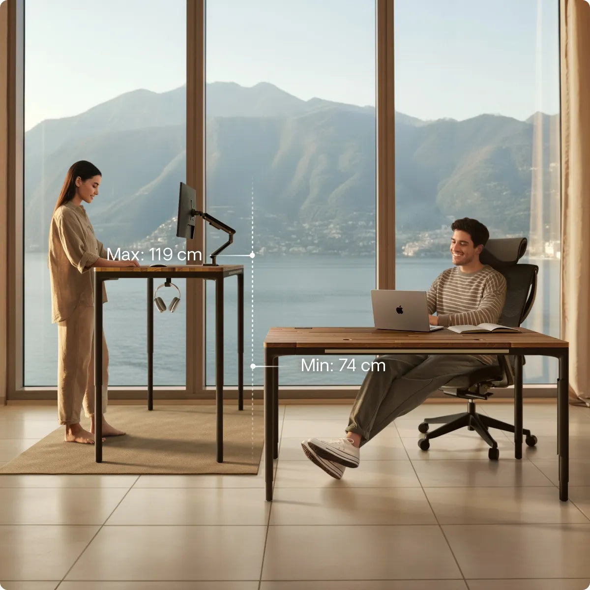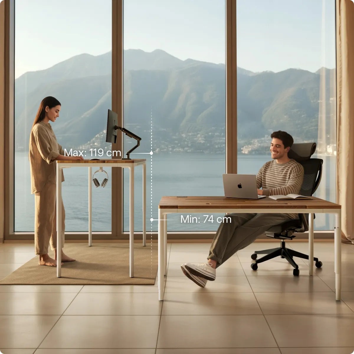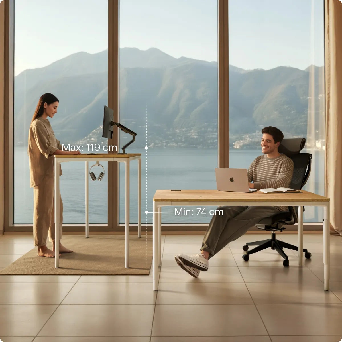 Je kunt de hoogte aanpassen van 71,5 tot 116,5 cm (zonder 2,5 cm tafelblad). Het reageert op de lichtste aanraking en heeft slimme anti-botsings- en kinderslotfuncties om elke beweging veilig te houden.