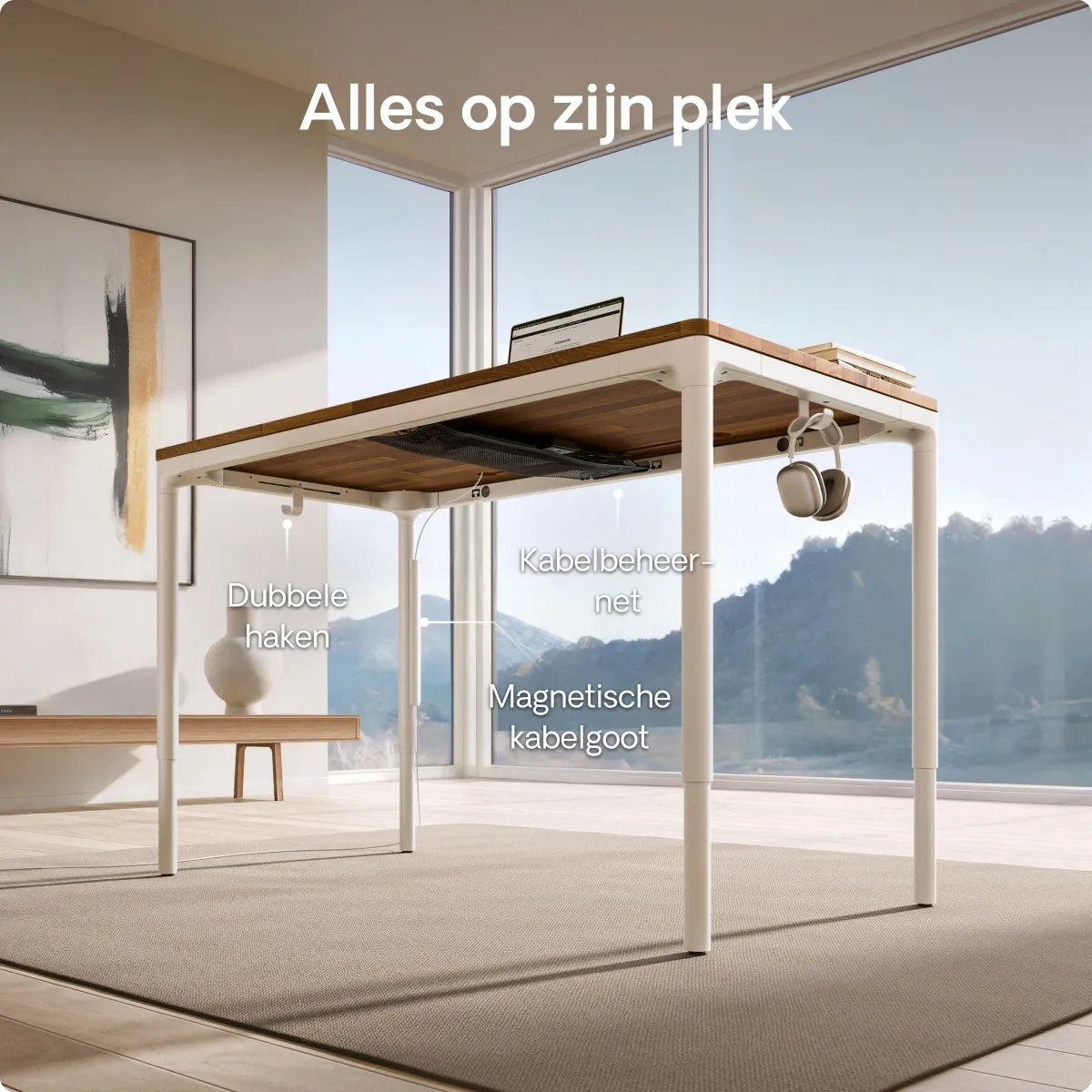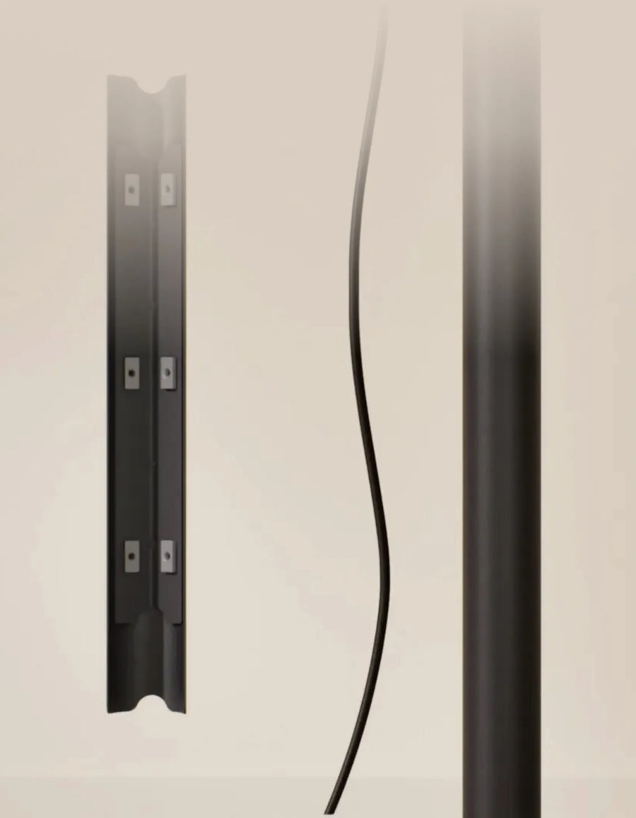 Wordt geleverd met premium accessoires: een magnetische kabelgoot en dubbele haken, die normaal gesproken apart worden verkocht, zijn nu zonder extra kosten inbegrepen. Het kanaal leidt kabels netjes langs het frame, terwijl uitsparingen aan de achterkant de draden uit het zicht houden voor een nette, opgeruimde opstelling.