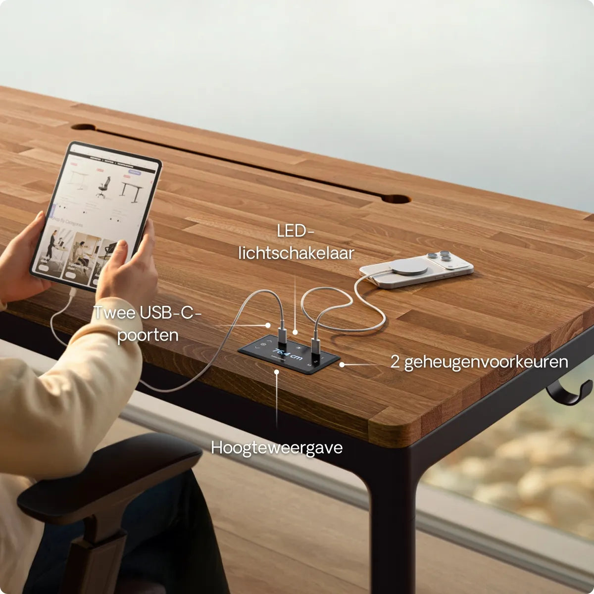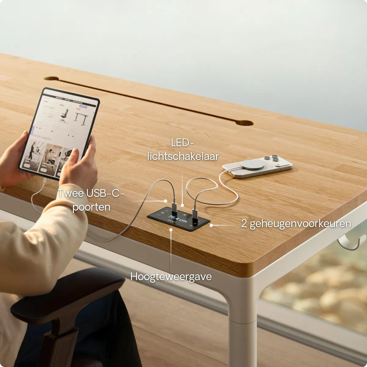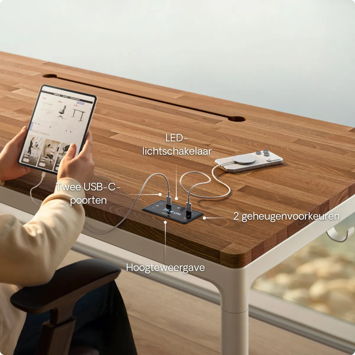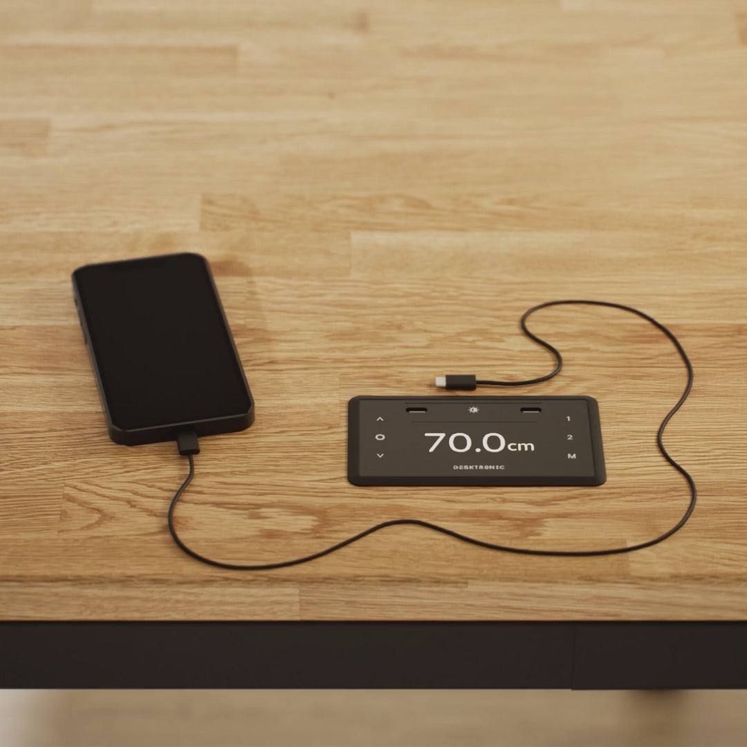 Het intuïtieve touchscreen maakt het eenvoudig om je bureau aan te passen, met een nauwkeurige hoogteweergave en 3 vooraf ingestelde geheugens voor snelle toegang. Dankzij de geïntegreerde USB- en USB-C-laadpoorten blijven je apparaten opgeladen en altijd gemakkelijk bereikbaar.