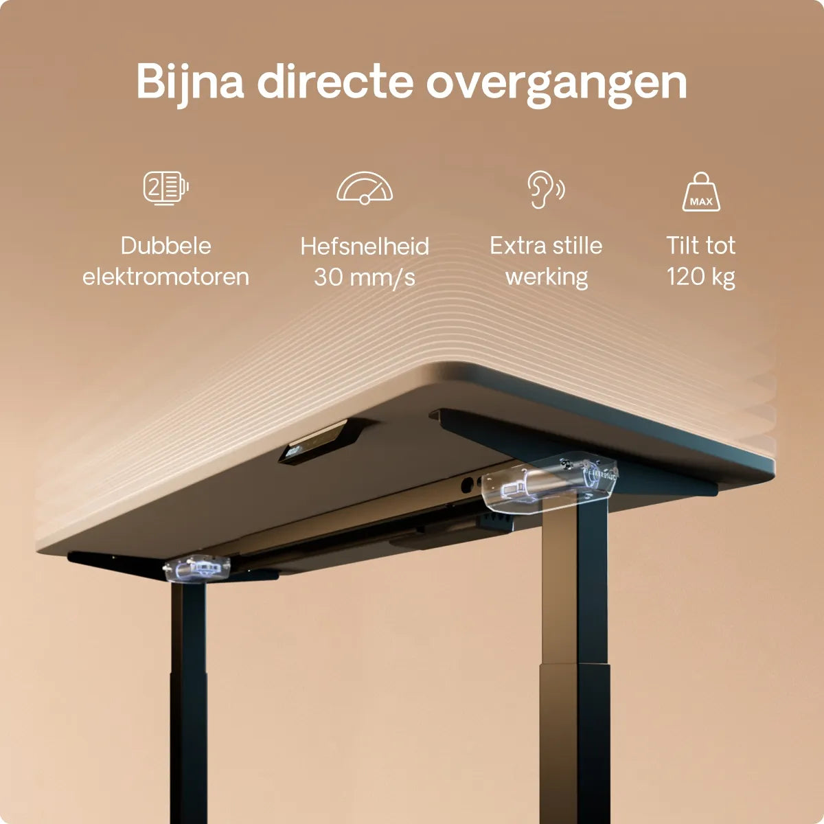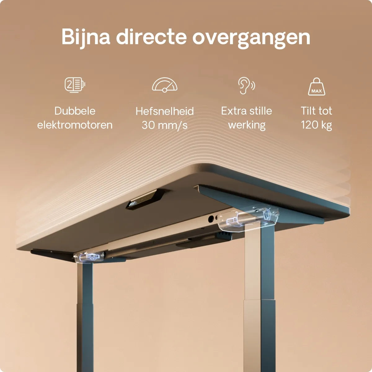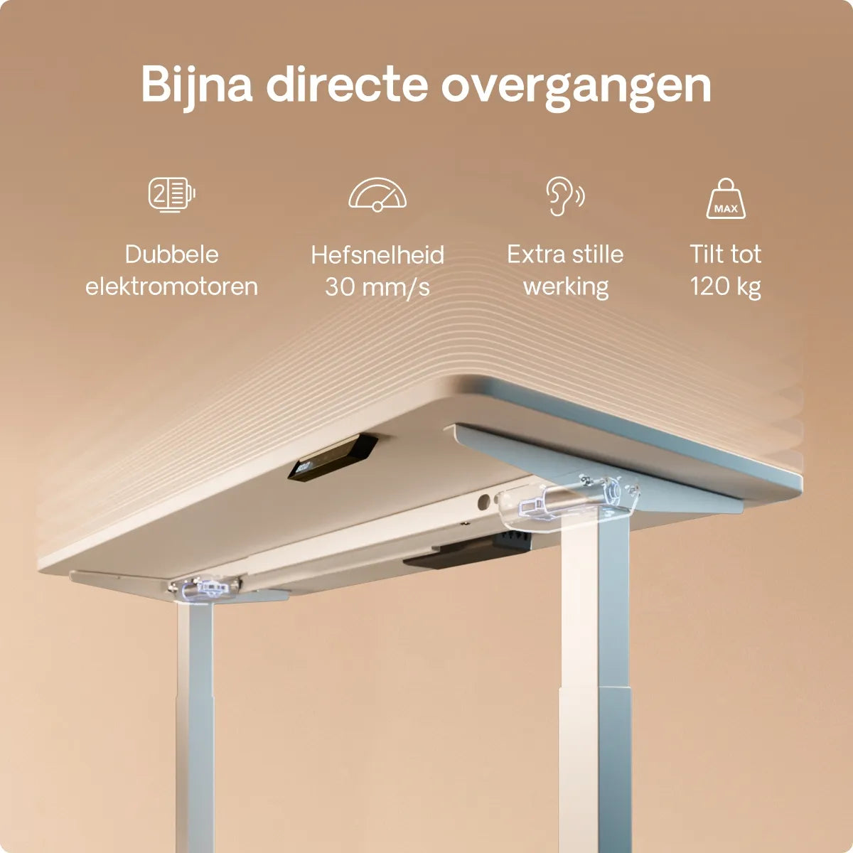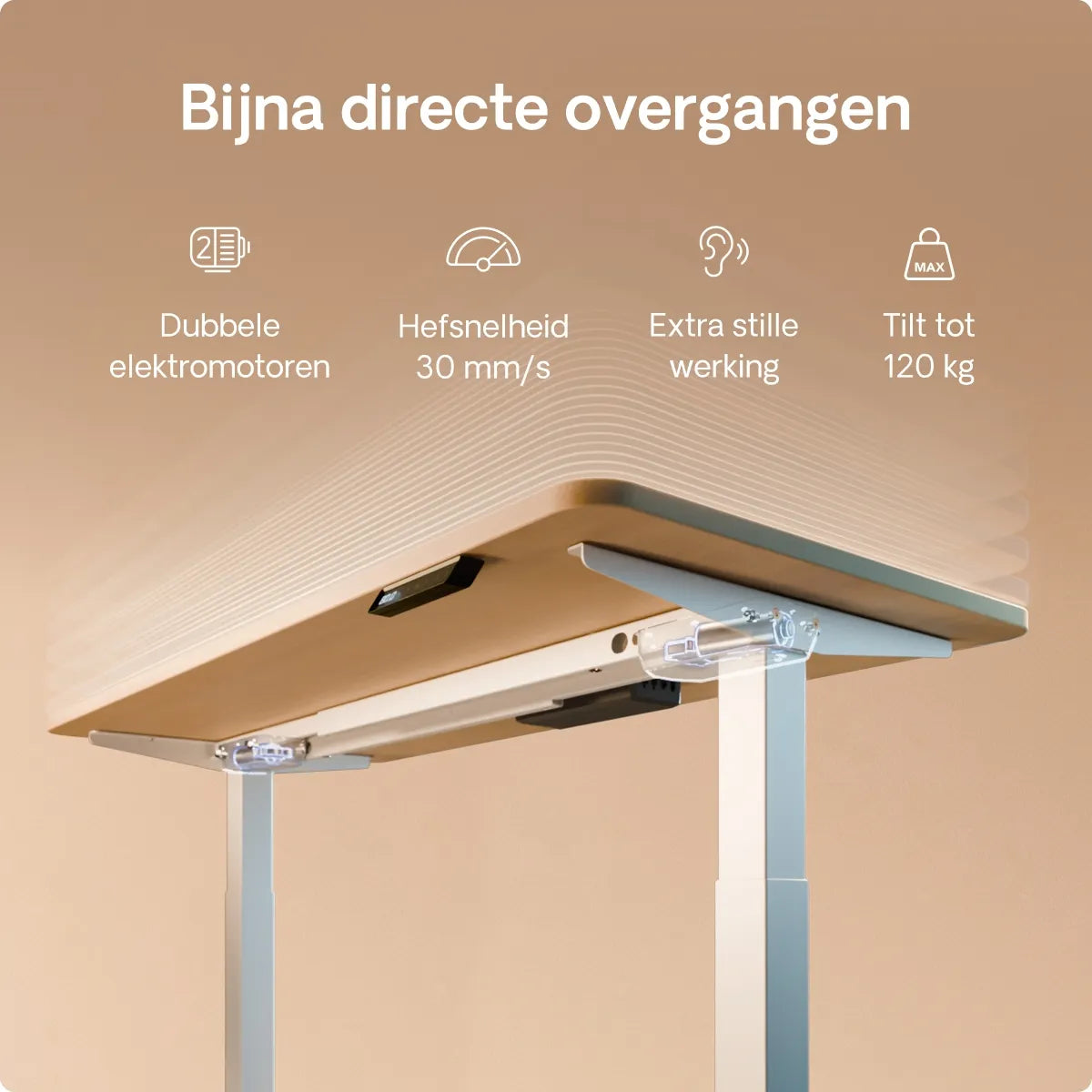 ervaring dankzij hoogwaardige materialen, design en elektronica. Het marktleidende twee-motorig systeem zorgt voor snelle, soepele en stille hoogteverstellingen. Het verstevigde stalen frame biedt dit bureau bijzonder goede stabiliteit en een betrouwbare werkplek tijdens intensieve werksessies. Het moderne bedieningspaneel met 3 geheugenstanden stelt je favoriete hoogte in met één druk op de knop. Geïntegreerde USB/USB-C-poorten houden je apparaten opgeladen en binnen handbereik. Inclusief een voorgeboord tafelblad naar keuze en gereedschap voor eenvoudige montage.