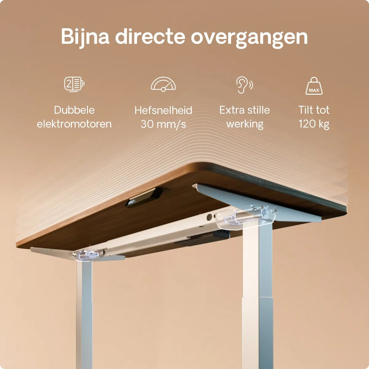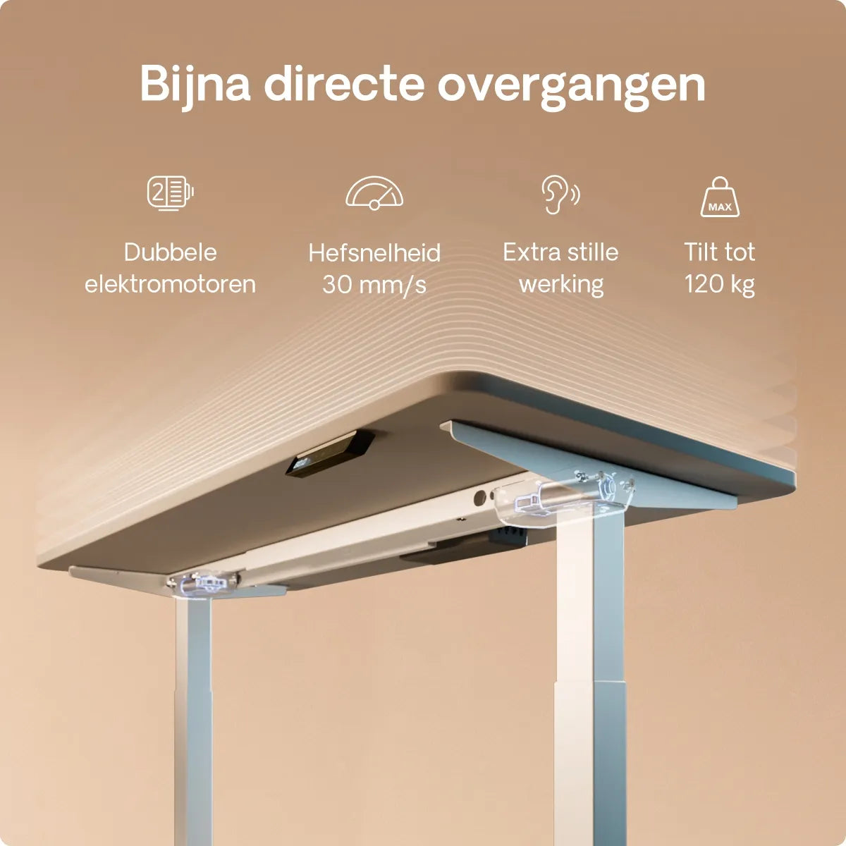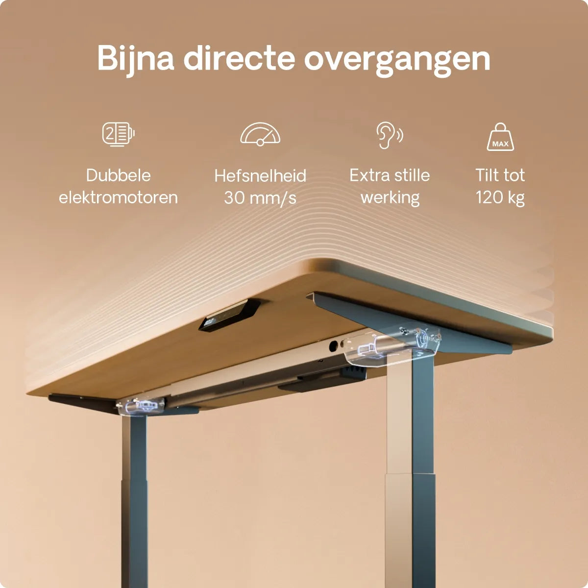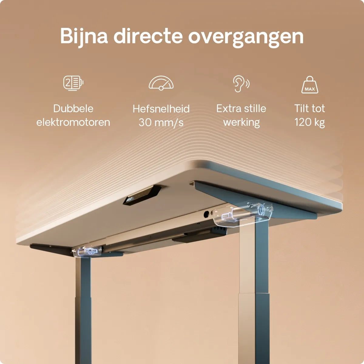 ervaring dankzij hoogwaardige materialen, design en elektronica. Het marktleidende twee-motorig systeem zorgt voor snelle, soepele en stille hoogteverstellingen. Het verstevigde stalen frame biedt dit bureau bijzonder goede stabiliteit en een betrouwbare werkplek tijdens intensieve werksessies. Het moderne bedieningspaneel met 3 geheugenstanden stelt je favoriete hoogte in met één druk op de knop. Geïntegreerde USB/USB-C-poorten houden je apparaten opgeladen en binnen handbereik. Inclusief een voorgeboord tafelblad naar keuze en gereedschap voor eenvoudige montage.
